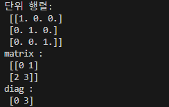 - np.diag(v) : 벡터 v의 값을 대각선 원소로 하는 행렬을 생성하거나, 배열의 대각 성분을 추출