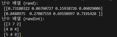 - np.random.rand(d0, d1, ...): 0과 1 사이의 균일 분포 난수를 사용하여 지정한 모양의 배열을 생성