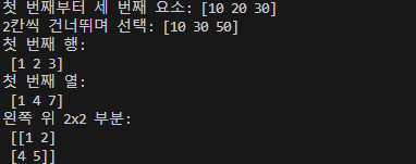 print("왼쪽 위 2x2 부분:\n", array_2d[0:2, 0:2])