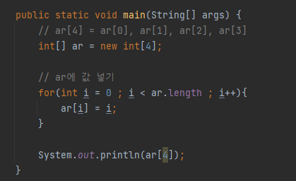 - 배열의 크기보다 인덱스가 크거나 음수가 들어갔을때 나오는 오류